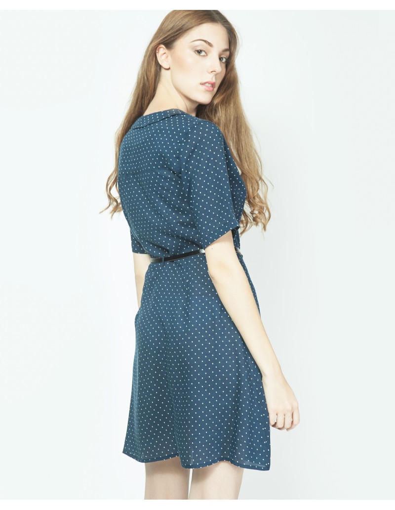 Vestido corto camisero con cuello solapa. Silueta entallada hasta la cintura, manga corta y canesú en la espalda. Cierre de botones en la parte delantera. Correa de polipiel desmontable a la cintura.
